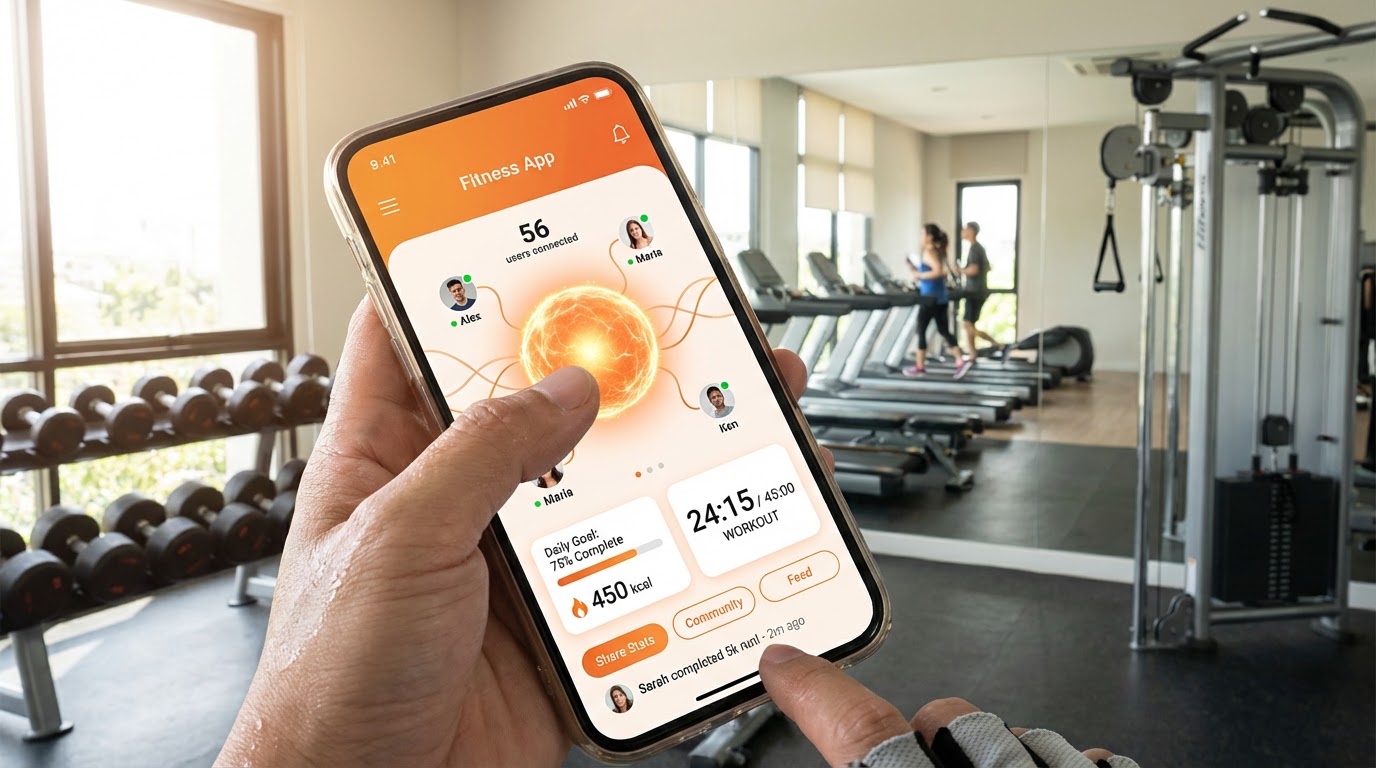 Nous avons conçu une interface centrée sur une « boule d'énergie » orange qui grossit selon le nombre d'utilisateurs actifs. L'application permet de créer des séries d'exercices, d'intégrer des vidéos d'exemple et de générer des fiches de performance sociales avec photo post-effort.